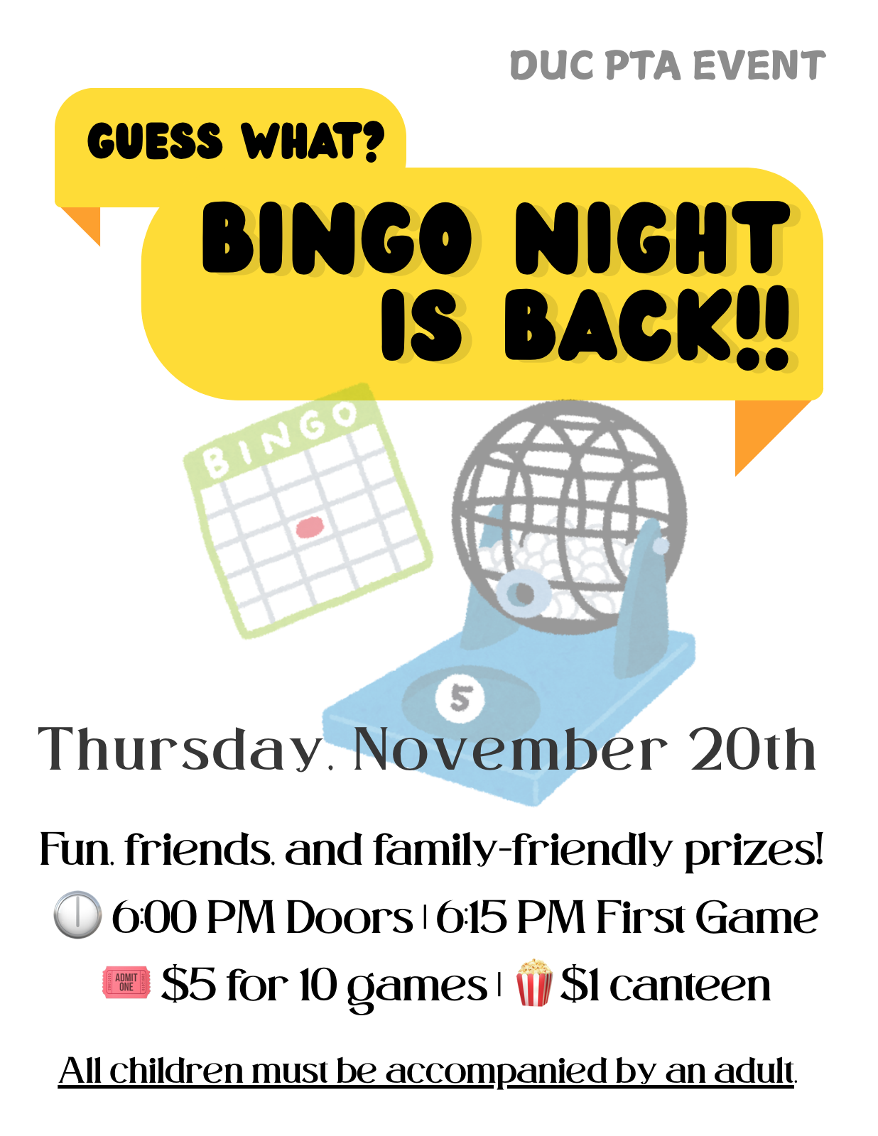 November 21st Duc PTA is hosting a BINGO NIGHT!